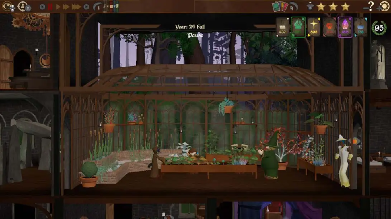 所有建筑、设施、教师与学生均以卡牌形式出现。玩家通过消耗金币或对应魔法派系的魔力进行三选一抽卡,获取光明、自然、奥术、暗影、炼金等不同体系的建筑与道具。重复抽到相同卡牌可升级建筑,解锁特殊功能,如仓鼠塔影响下方建筑高度,需谨慎布局。